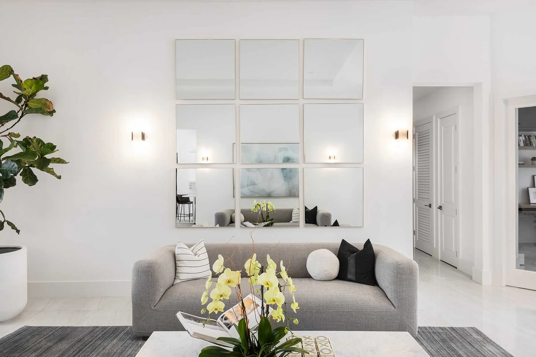 Project description for dedicated page: This spacious single-family residence in Pinecrest was envisioned as a clean, modern home softened by warmth, comfort, and thoughtful detail. Our scope combined furniture and décor selections with window treatments, wallpaper accents, and—most importantly—custom millwork. Working in close collaboration with the clients, we translated their desire for a refined modern look into spaces that feel elevated yet livable. Neutral textures, warm oak tones, and versatile furnishings ensure that the interiors remain contemporary without ever feeling cold.
