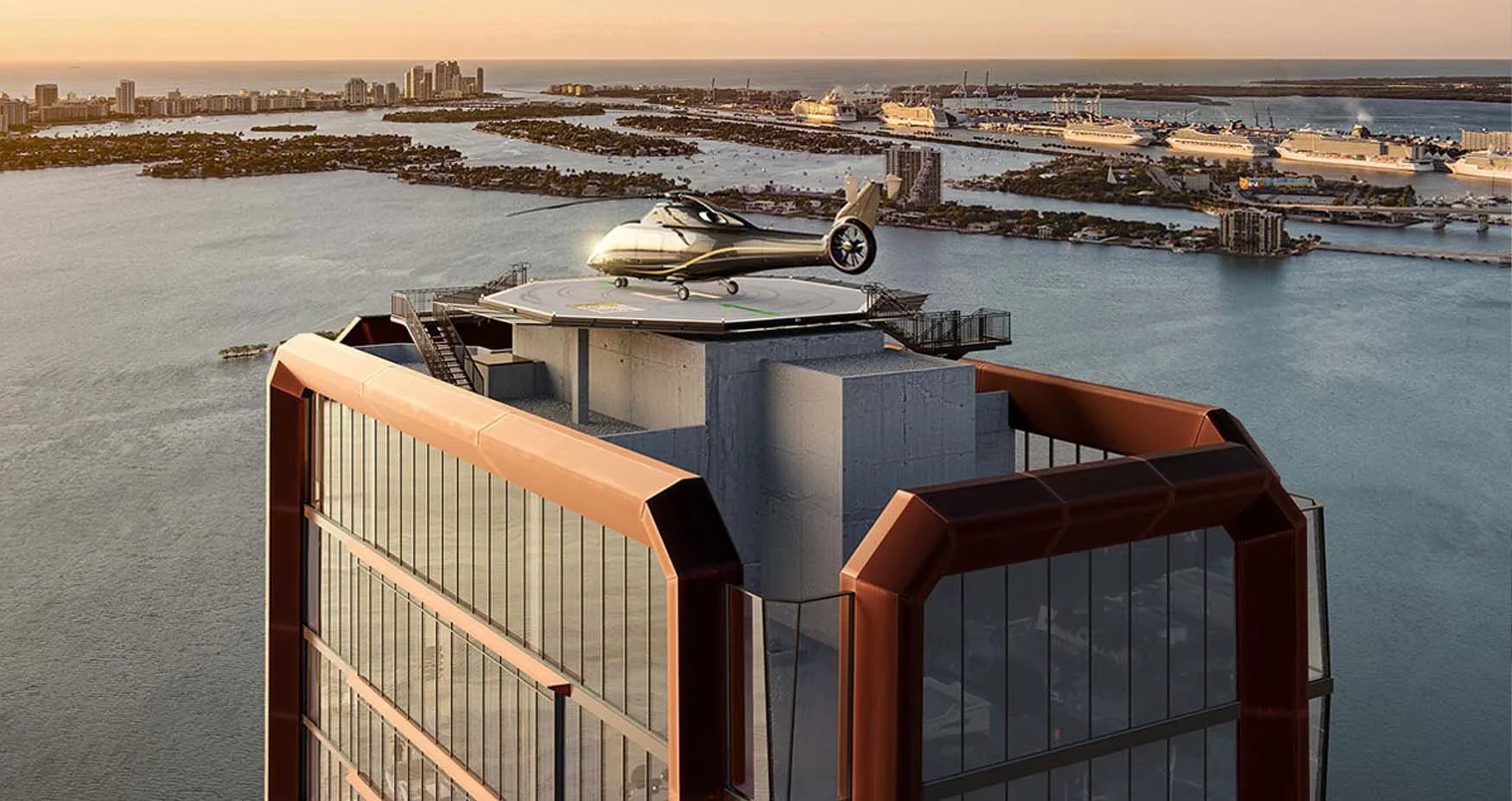 Gourmet kitchens, designed by Mario Carbone, are equipped with top-of-the-line CornuFé ranges, Wolf and Sub-Zero appliances, and Taj Mahal Quartzite countertops. Custom Italian cabinetry and walk-in pantries complete the culinary experience.Primary suites are havens of luxury, boasting sweeping water views, lounge areas, and direct balcony access. Spa-like bathrooms feature premium materials, oversized soaking tubs, and Dornbracht and Duravit fixtures. Smart home technology and energy-efficient design complete these exceptional residences. Oh, and did we mention there’s a rooftop helipad?